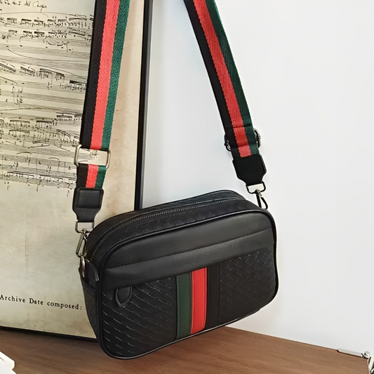 Stylish Black Crossbody Bag with Red & Green Stripe Strap